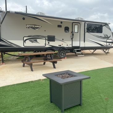 Our sites offer 50' angled RV/Tiny Home parking with 2 extra parking spots, full hookups, 50/30/20 amp electric, free Wi-Fi, concrete patios, turf area, picnic table, and propane fire pits (propane not included).