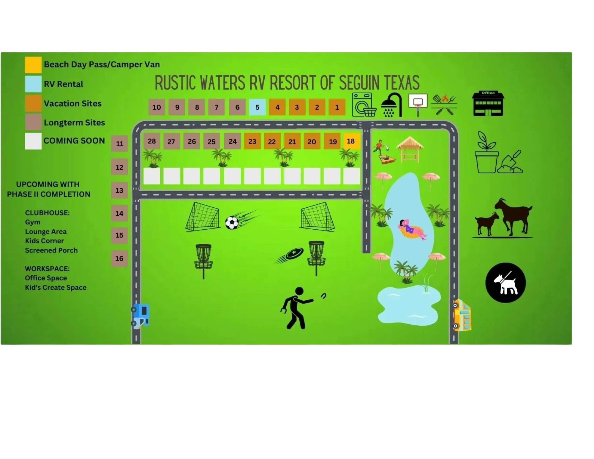 Our RV Resort offers a variety of activities for the whole family, including a swimming pond, firepits, Cornhole, Volleyball, Basketball, Soccer, Horseshoes, Giant Jenga, grilling stations, and much more. Create lasting memories with your loved ones at Rustic Waters RV Resort & continue to follow us as we expand our Resort!!